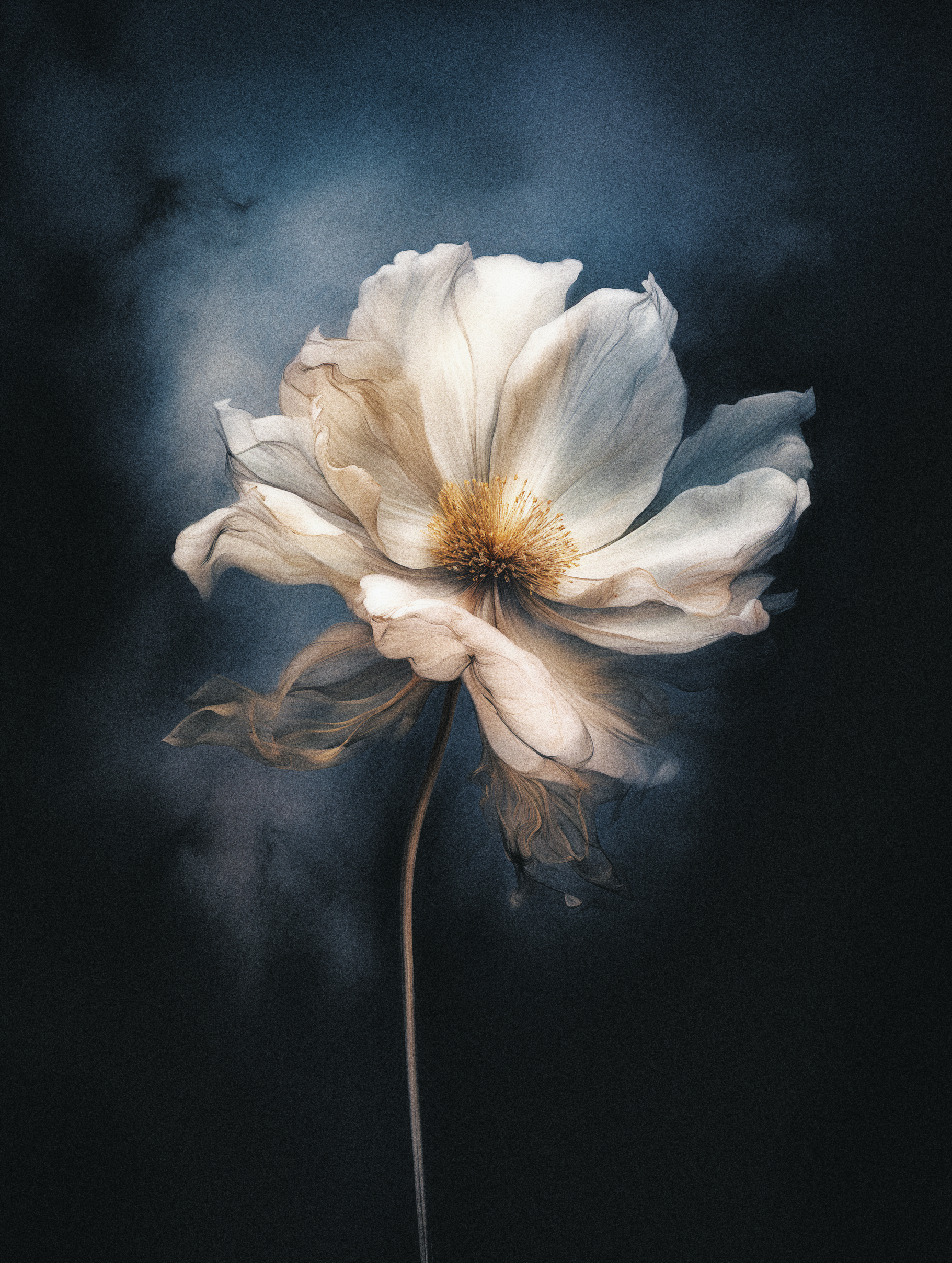 In this garden, flowers are not born from roots, but from emotions left behind: joy that faded, grief that lingered, love that once burned. They take shape as fragile petals, trembling between light and shadow, caught in a fleeting glow. Every flower is a ghost—an echo of something that once was. This garden is not eternal. It opens only for those who dare to see it. And when its flowers are taken, they do not vanish… they live on in the one who carries them.